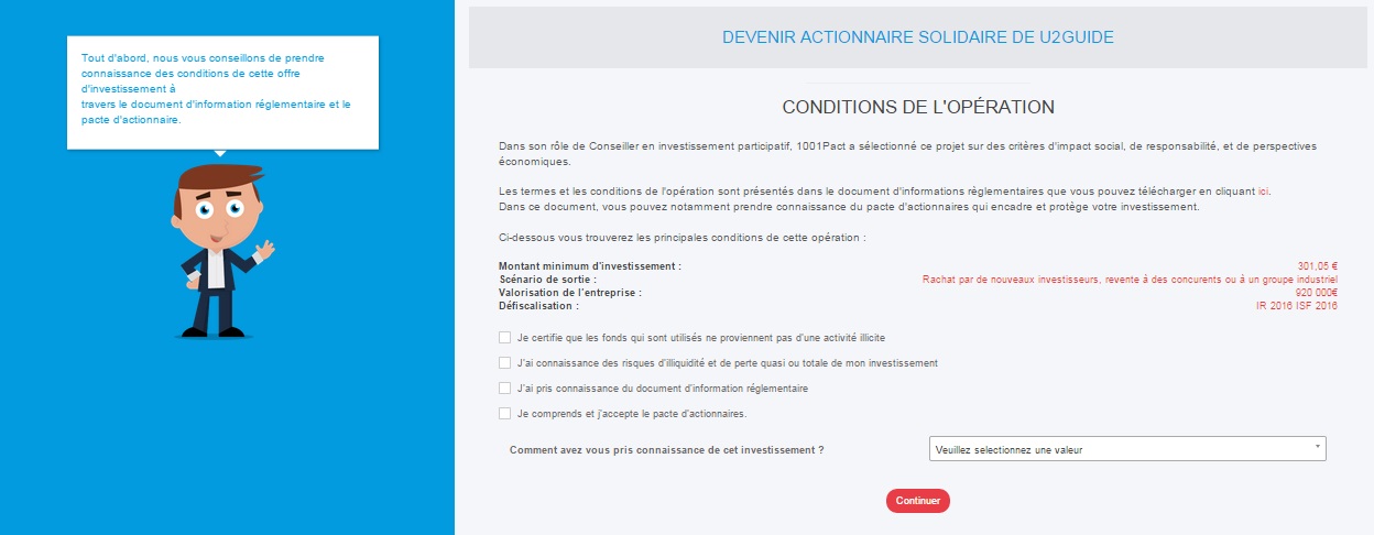 1001PACT develops the crowdfunding solidarity capital and allows individuals or companies to become supportive shareholder from €100. It is much better than the industry average and this truly democratizes the shareholding.