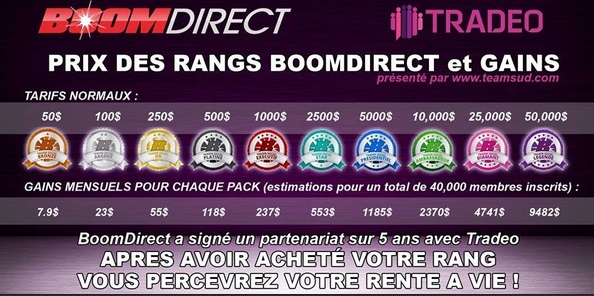 Con BoomDirect, se obtiene su pago cada mes. De hecho, una nómina, incluyendo sus comisiones según tu rango de posicionamiento, sus comisiones de patrocinio y su bono es transferida a su cuenta el primer día del mes y cada mes!