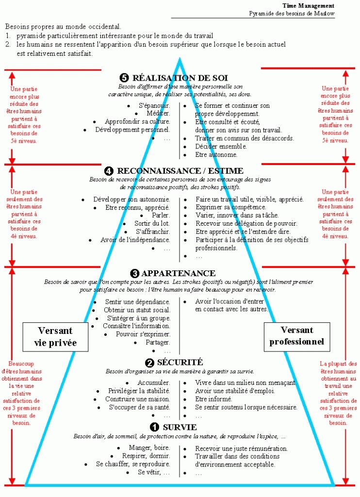Certains auteurs ont par contre distingué la pyramide en deux versants, l´un coté vie privée et l´autre vie professionnelle ce qui permet vraiment de voir le coter management.
