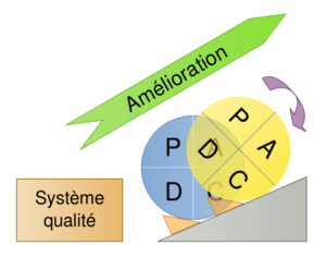 La roue de deming est un procésus d’amélioration de la qualité en 4 étapes simples qui sont PDCA ( planifier-faire-vérifier-agir ou planifier-faire-vérifier-ajuster ). En anglais plan do check adjust. Ce processus est également connu sous le nom de cercle / cycle / roue de Deming , du cycle de Shewhart , du cercle / cycle de contrôle ou du plan-do-study-act ( PDSA ). Une autre version de ce cycle PDCA est OPDCA. Le « O » ajouté est synonyme d’ observation . Cet accent mis sur l’observation et l’état actuel a une incidence sur la fabrication sans gaspillage et le système de production de Toyota .